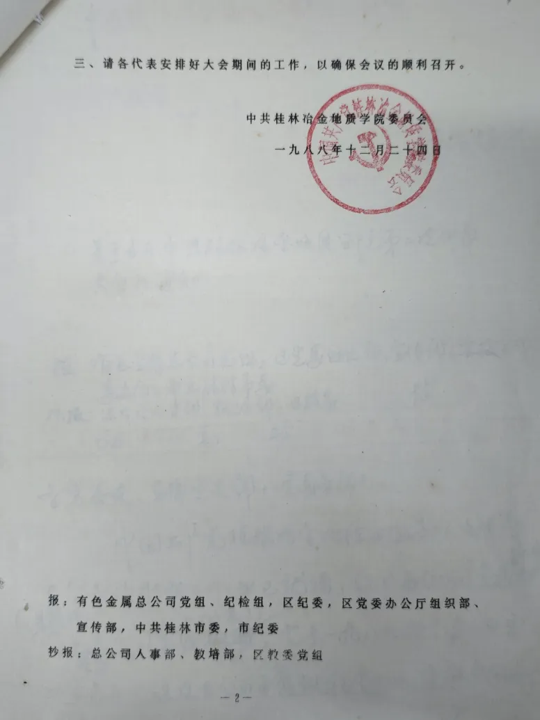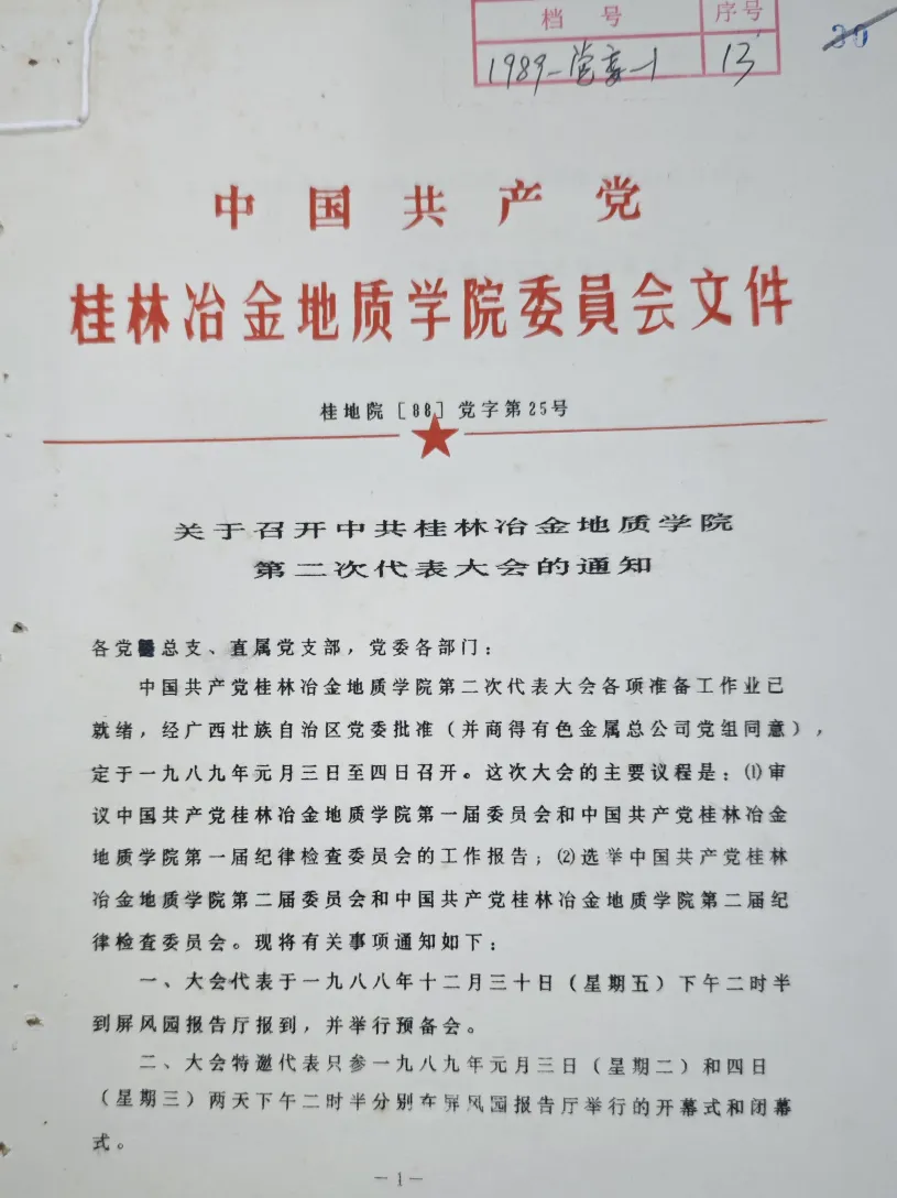 【1】关于召开中共桂林冶金地质学院第二次代表大会的通知,桂林理工大学档案馆馆藏,1989-党委-1-13.