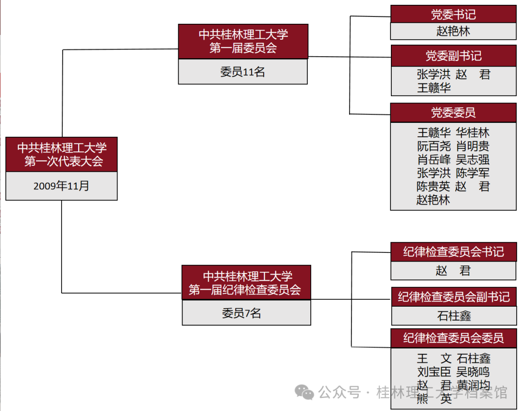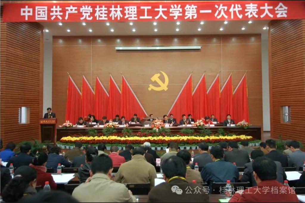 2009年11月29日,中国共产党桂林理工大学第一次代表大会在图书馆报告厅召开。大会正式代表189名,自治区高校工委副书记、高校纪工委书记孙海潮,桂林市委副书记、组织部部长潘永健,自治区党委组织部干部五处副调研员容芳,自治区高校工委组织部副部长、统战部部长汪维等出席大会。会上赵艳林同志代表学校上一届党委作了《继往开来,科学发展,为把我校建设成为特设鲜明的高水平理工大学而努力奋斗》的工作报告。大会主题是:高举中国特色社会主义伟大旗帜,以邓小平理论和“三个代表”重要思想为指导,深入贯彻落实科学发展观,总结过去四年的工作成绩和主要经验,提出今后一段时期学校发展的指导思想、奋斗目标和主要任务,团结带领全校党员和师生员工,在新的起点上,继往开来,科学发展,为把我校建设成为特色鲜明的高水平理工大学而努力奋斗。