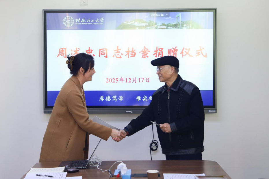 罗盛锋代表学校对周述忠老师心系学校、无私捐赠的慷慨之举表示诚挚的感谢和崇高的敬意,同时希望档案馆将妥善保管、充分利用好这批档案。他指出,周述忠老师是学校建设与发展的亲历者、奋斗者和贡献者,此次捐赠的档案是学校历史的真实拼图,是不可多得、无法复制的第一手资料,是“桂工精神”在老一辈教育工作者身上的真实写照与微观缩影,极大丰富了学校“三全育人”、校史研究的鲜活素材,为思政教育和学校高质量发展注入了精神动力。